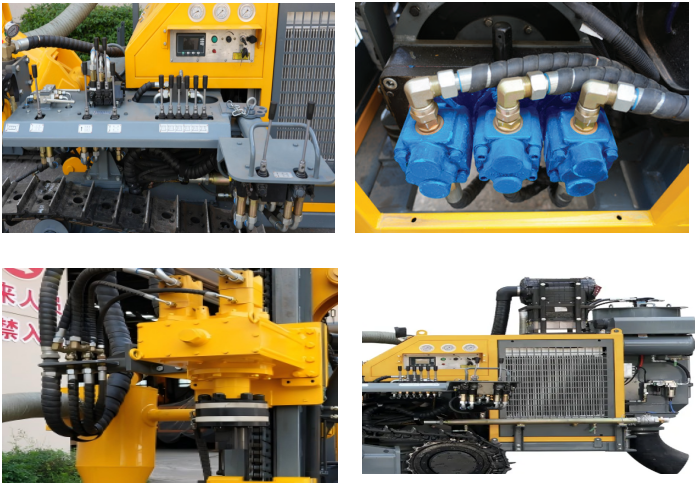 • Hydraulic System. The hydraulic system is equipped with first-class domestic brand hydraulic valve groups and cylinders, and is configured with imported high-efficiency hydraulic pumps and imported hydraulic hoses. The diameters of the hydraulic valves have been enlarged, significantly enhancing the overall performance of the hydraulic system. The independent dual-speed walking control system offers a good field of vision and safe operation. The integrated instrument panel can monitor the running status of the drilling vehicle in real time.