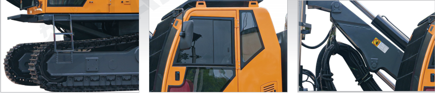 • Equipped with the automatic rod handling system, drill pipe floating joint module, drill pipe lubrication module, drill pipe sticking prevention system, hydraulic dry dust collection system, air conditioning cab, optional drilling angle and depth indication function, etc.